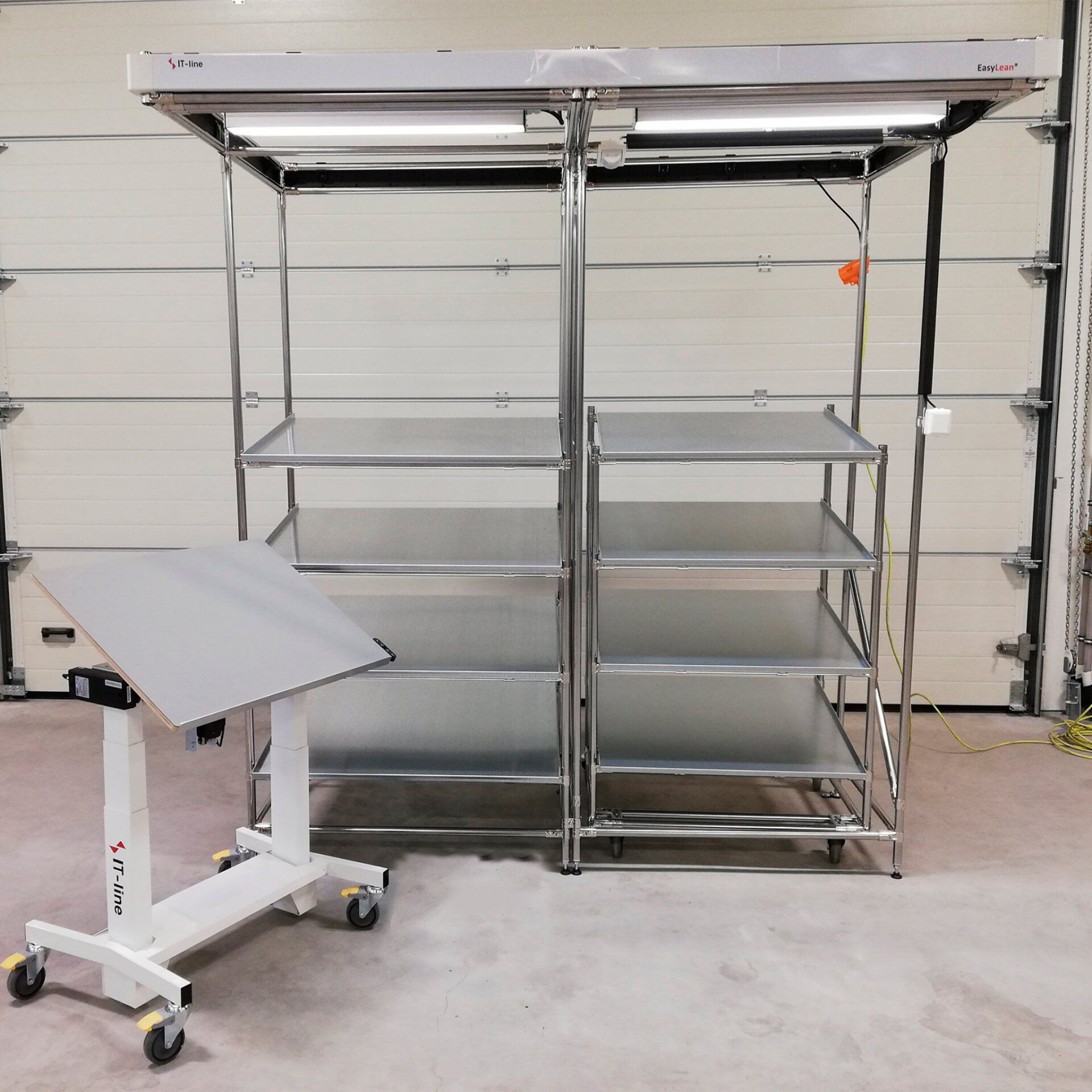 FiFo-Regale und Entnahmeregale, die von hinten befüllt werden, ermöglichen eine Materiallogistik, bei der die Montagearbeiten nicht durch den Materialverkehr gestört werden. Es ist einfach, die Regale und Geräte einer Standard-Workstation an ihren Verwendungszweck anzupassen.